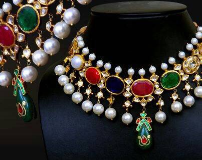 Nine stones each for one planet ruby , diamond,blue sapphire ,cats eye, coral, emerald, pearl, yellow sapphire.very popular in Mughal era . Used in necklaces bracelets with uncut stones, it counts for the priceless collection that period .